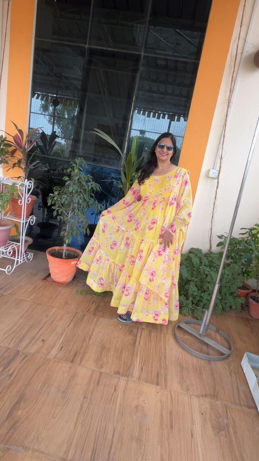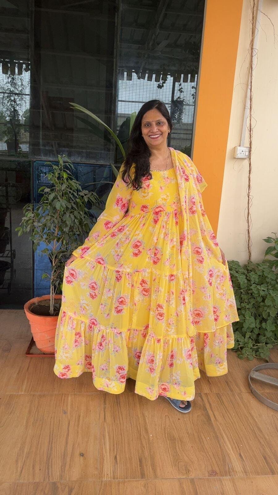 This yellow color floral printed Anarkali set features heavy pure soft fox georgette with a stunning floral print. Made with high-quality materials, this set is perfect for any occasion and will make you stand out with its elegant design. Don't miss out on this must-have set.